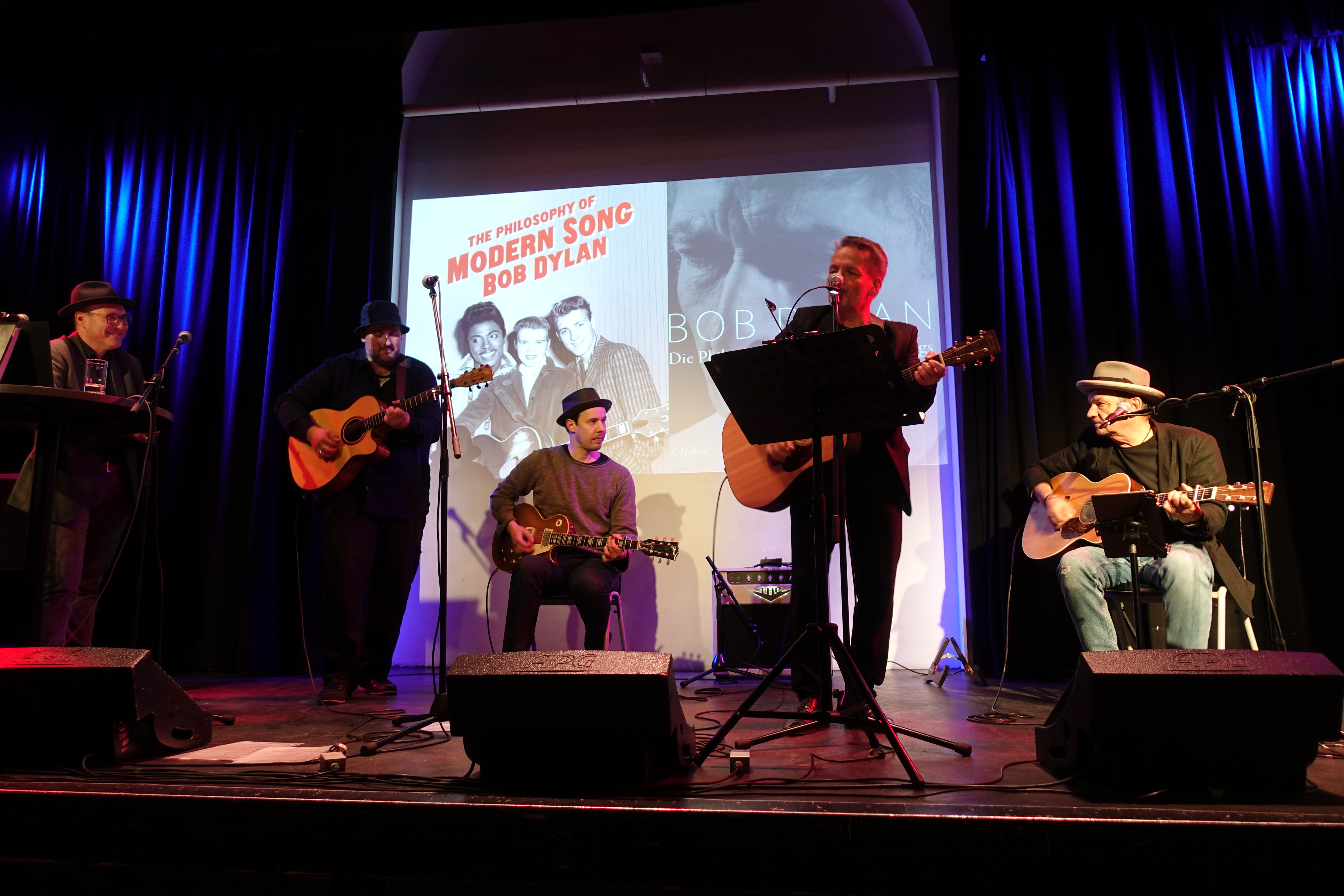 Das Programm des Abends begann dann mit Dylans „When I Paint My Masterpiece“ gespielt von den „Dylan All-Stars“, Dan Dietrich, Martin Grieben und Four Chords & The Truth aka Bernd Hoffmann und Philipp Wetzel. Thomas Waldherr bedankte sich dann beim C.H. Beck-Verlag für die Unterstützung des Abends und stellte Mitwirkende und Ablauf vor.