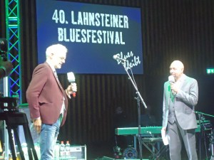 Moderator Arnim Töpel bringt in seiner Begrüßung die Atmosphäre in der Halle auf den Punkt, als er sich einen Bluesclub versetzt fühlt. Nach seinem Beginn mit dem trotzigen A-Cappella-Stück „Blues bleibt“, führt er als diesjährigen Co-Moderator Rolf Hüffer ein. Seit dem Jahr 2000 produziert und moderiert Hüffer alljährlich den 90-minütigen TV-Film vom Lahnsteiner Bluesfestival. Gemeinsam werden sie an diesem Jubiläumsprogramm Abend moderieren und kurze Interviews mit den Künstlern führen.